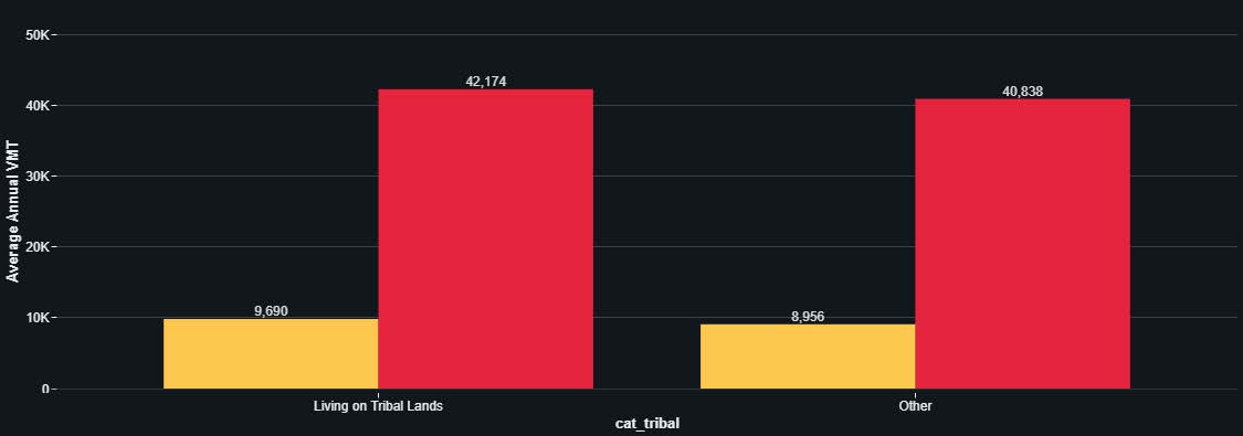 Drivers living on tribal lands are classified as such if they live in a 2010 block group with the majority of its area intersecting with the American Indian/Alaska Native/Native Hawaiian (AIANNH) Areas Shapefile.